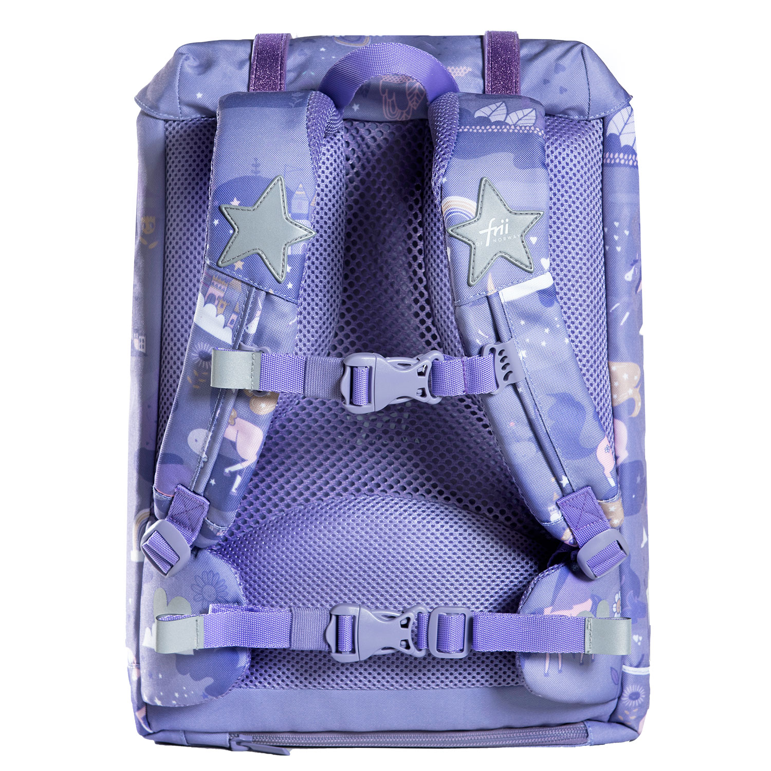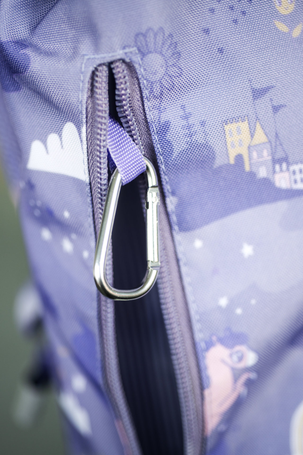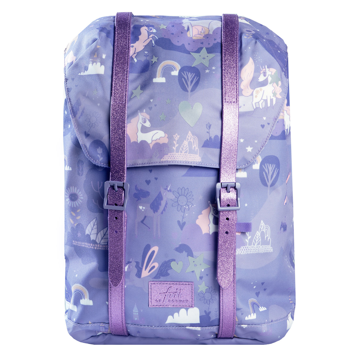 For everyone who loves unicorns, this backpack is a must! Fairytale design with unicorns, horses, rainbows, magic dust, and dream castles – from the children’s own dream world. Beautiful colors in purple and pink shades, with details in gold! And coolest of all: Straps with glitter! Reflectors are integrated with the design on all sides, like stars and hearts. And the backpack is of course super comfortable to wear! Easy to open and close with the magnetic closures on the straps. Clever, isn’t it? Side pocket for a water bottle and a snap hook for keys – or important decorations. If they aren’t already dangling from the loop on the front of the backpack. Matching rain cover in a separate pocket.
