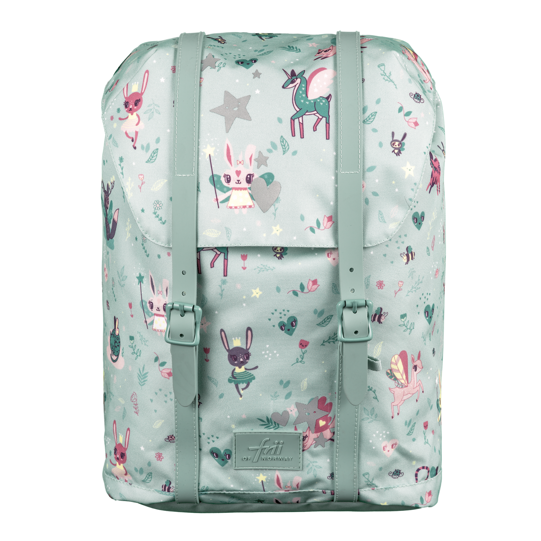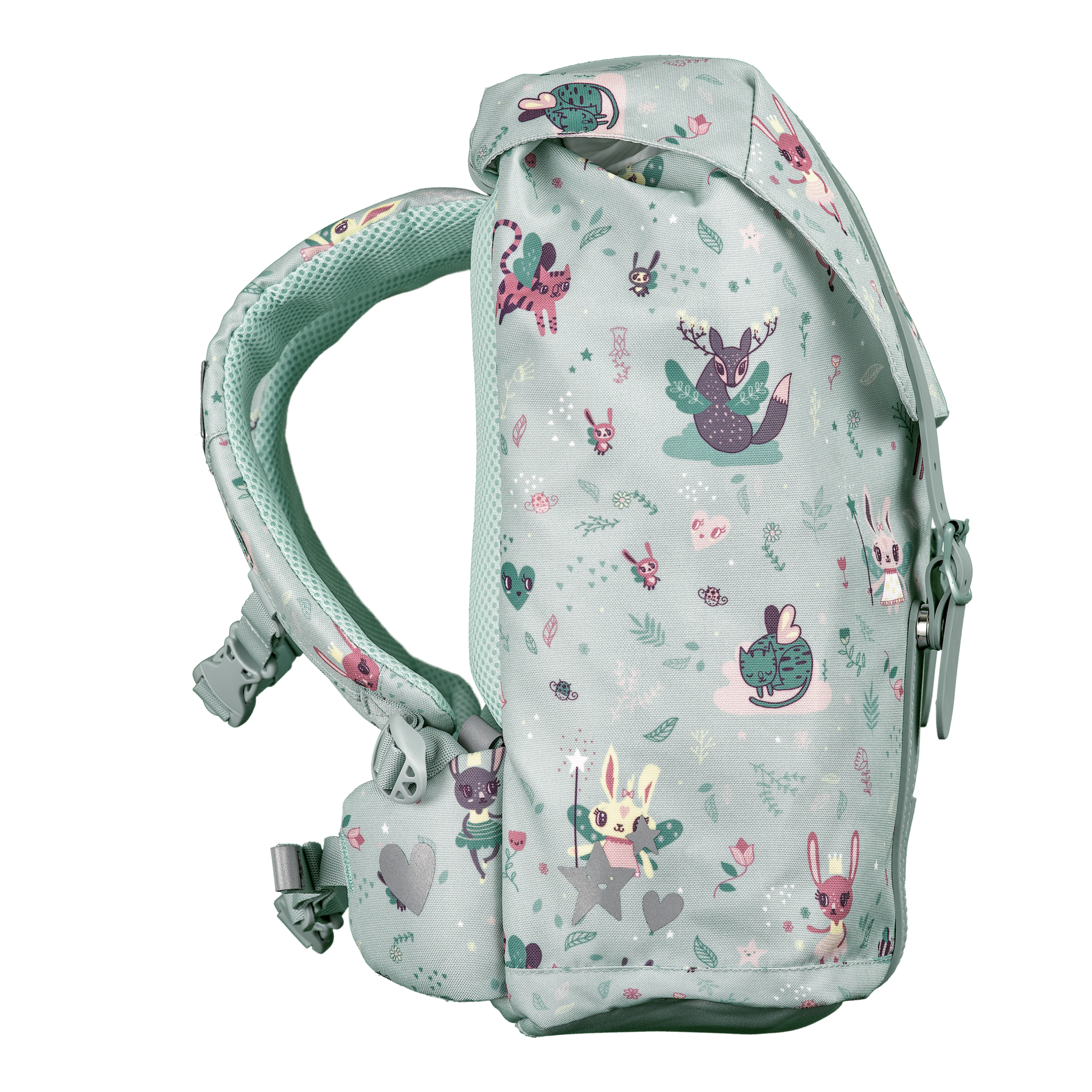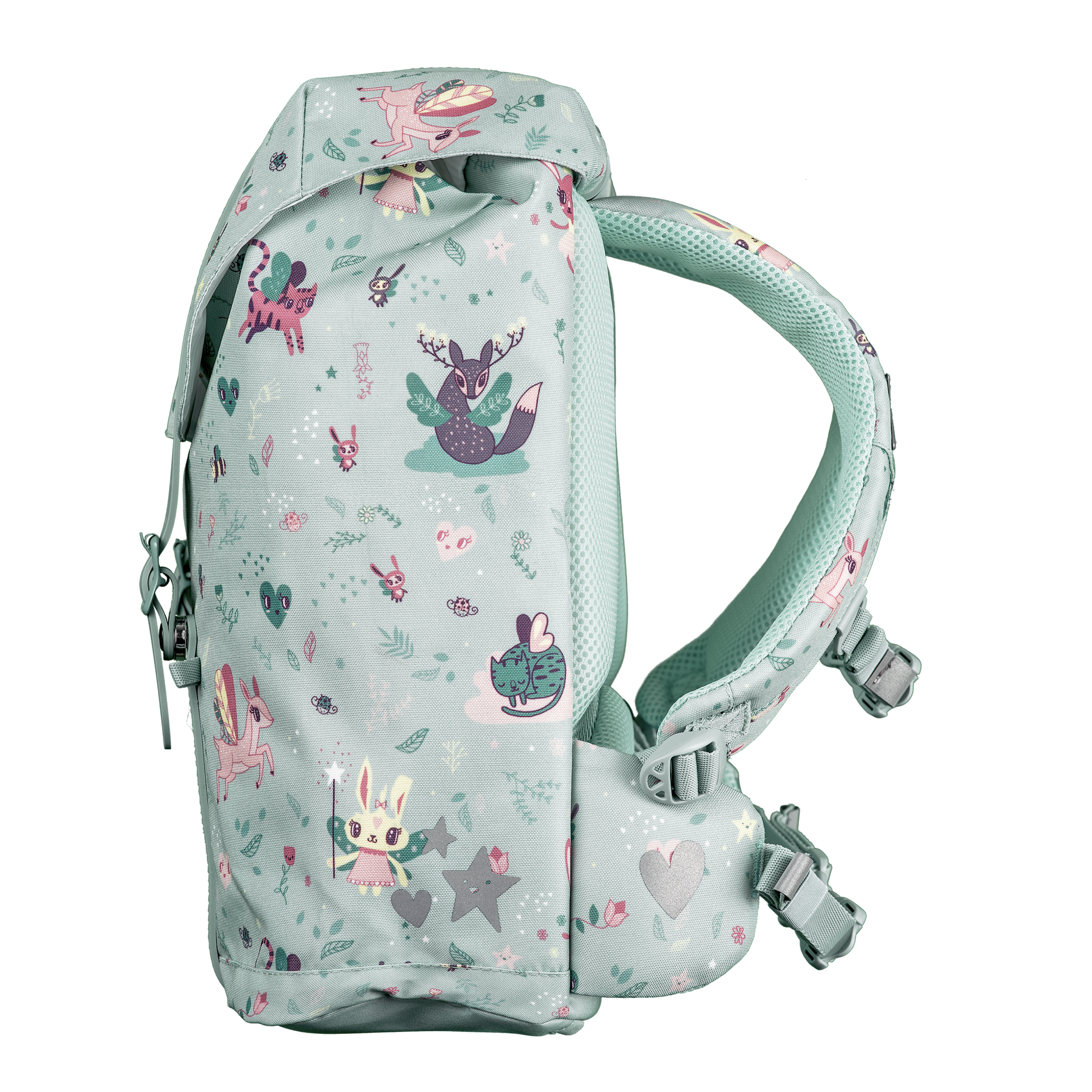 Imaginative backpack with super cute flying animals, flowers and bees. Lovely, subtle mint green colour with details in petrol, yellow, and pink. Reflectors are integrated in the design as stars and hearts.
