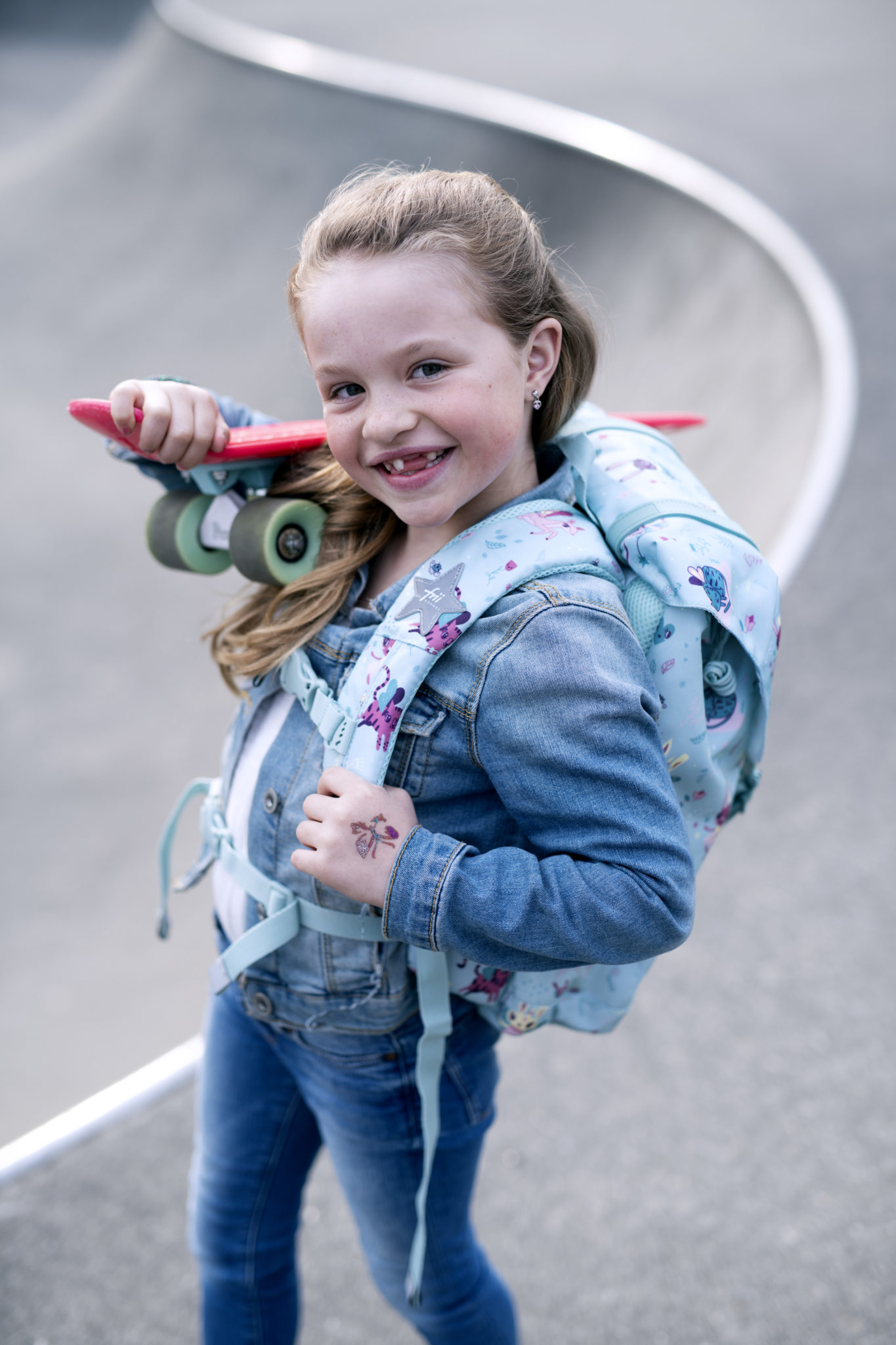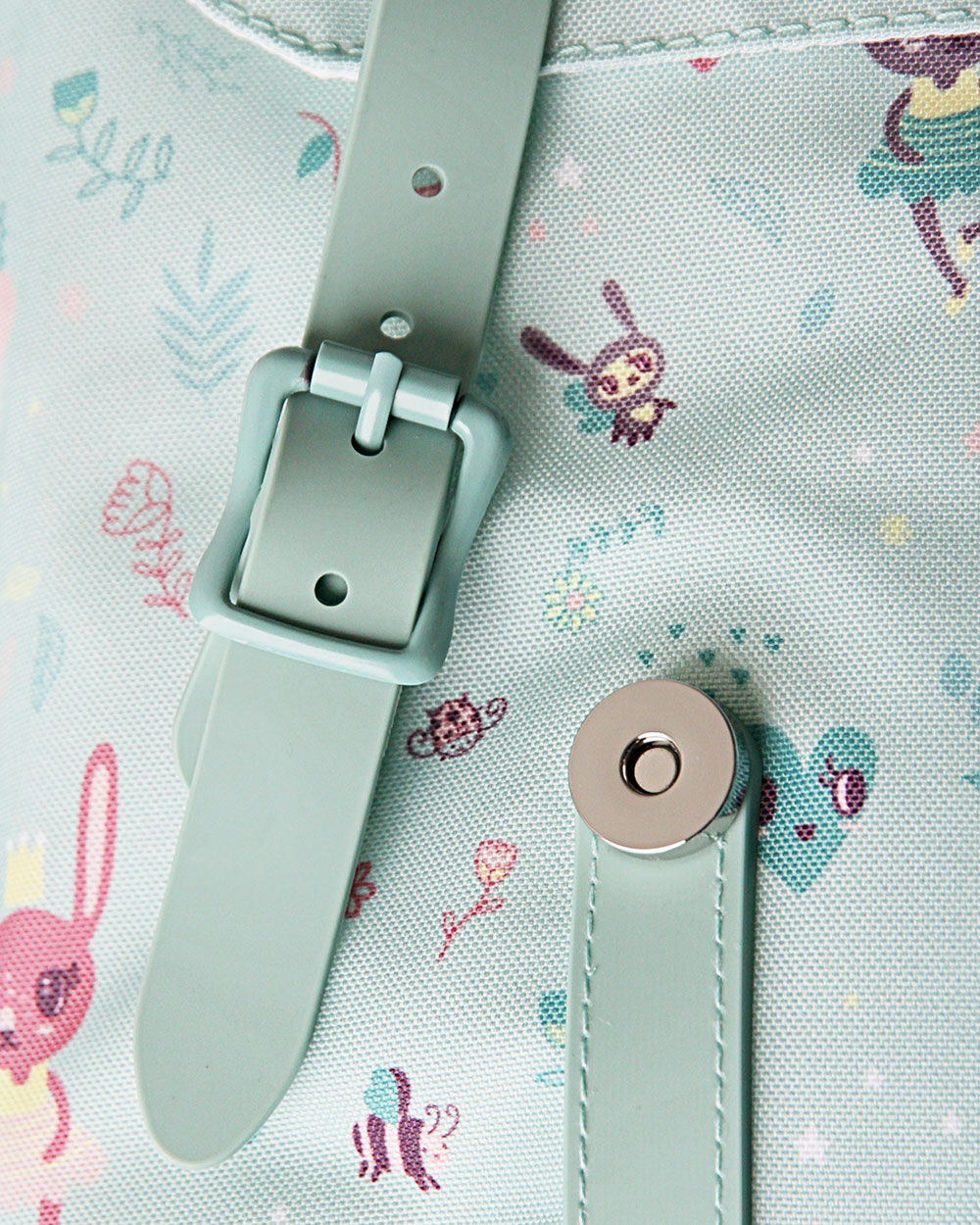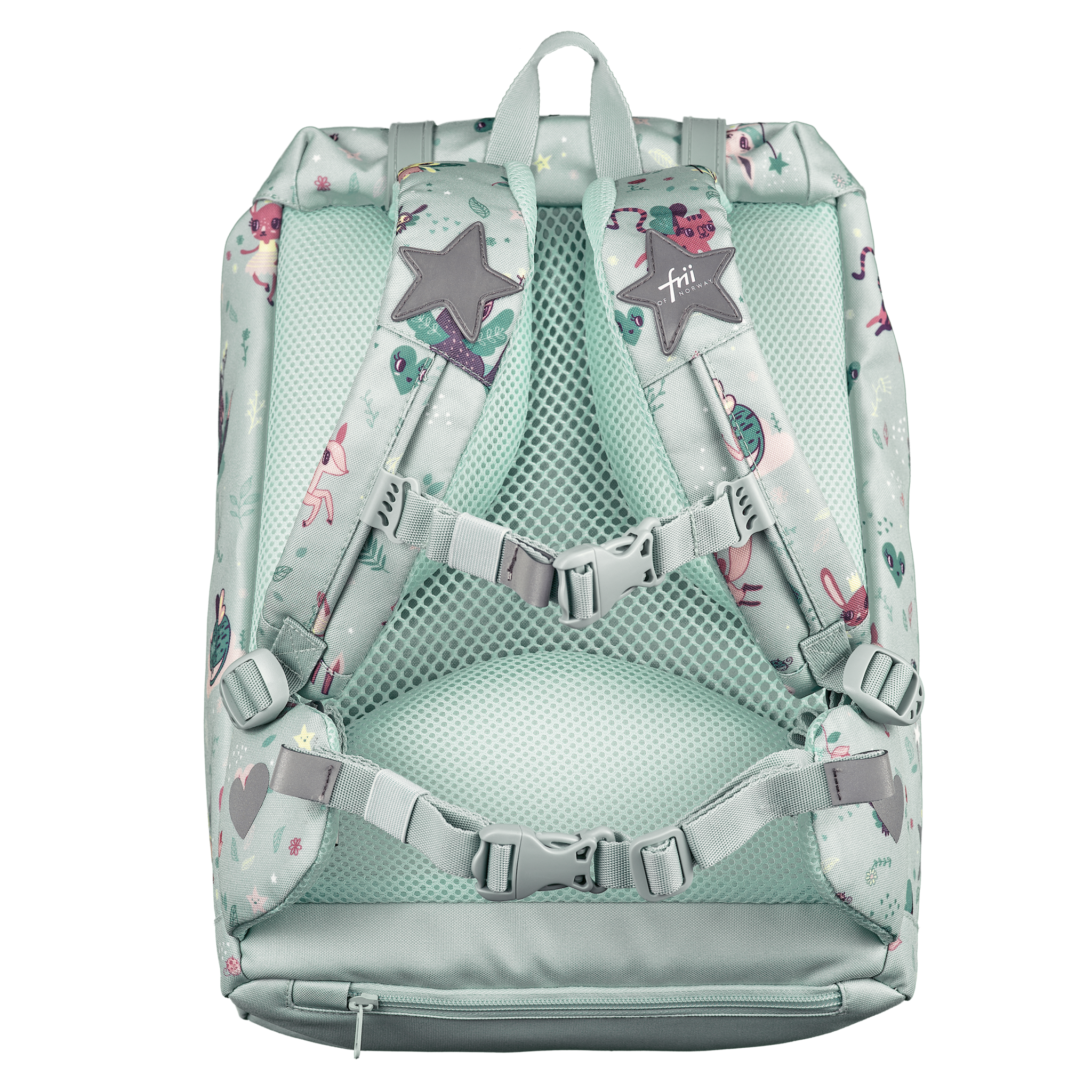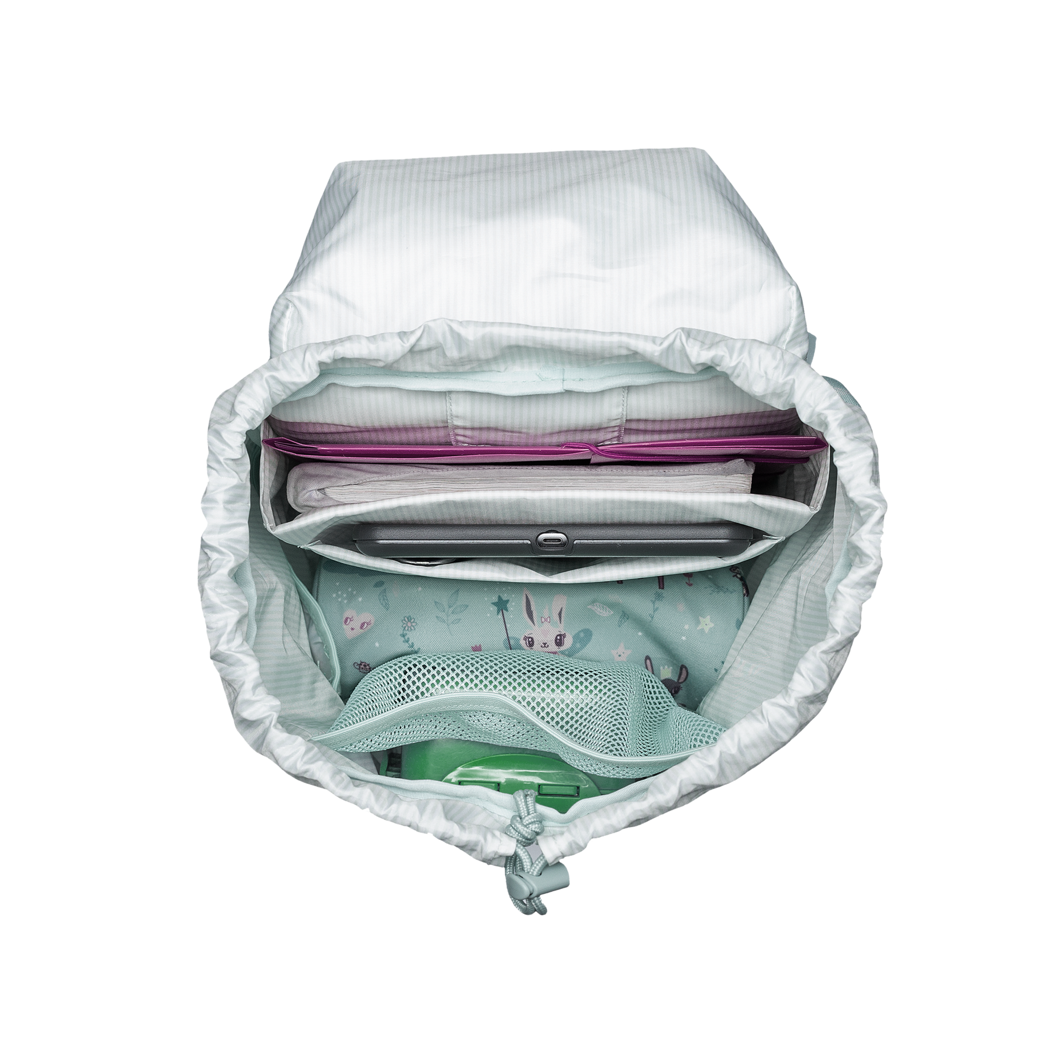 Imaginative backpack with super cute flying animals, flowers and bees. Lovely, subtle mint green colour with details in petrol, yellow, and pink. Reflectors are integrated in the design as stars and hearts.