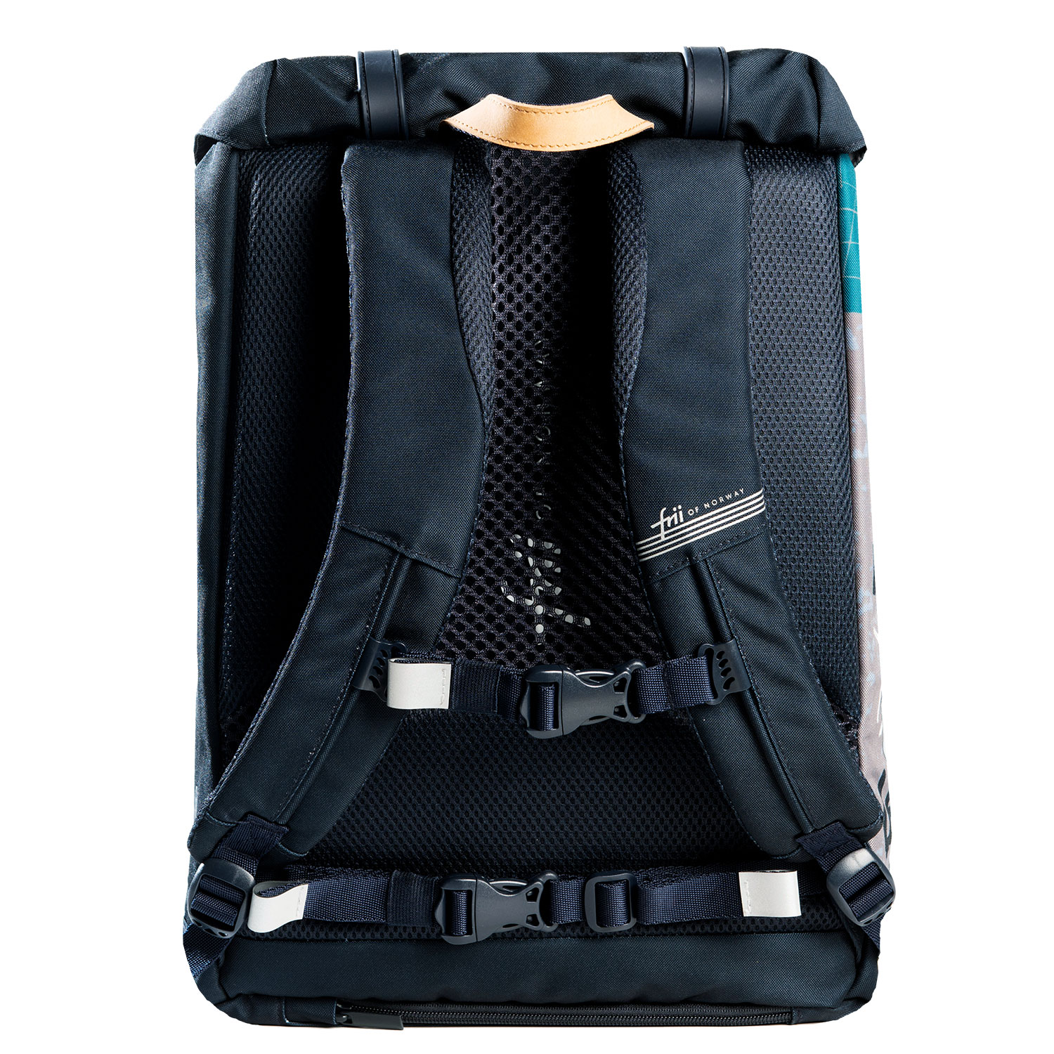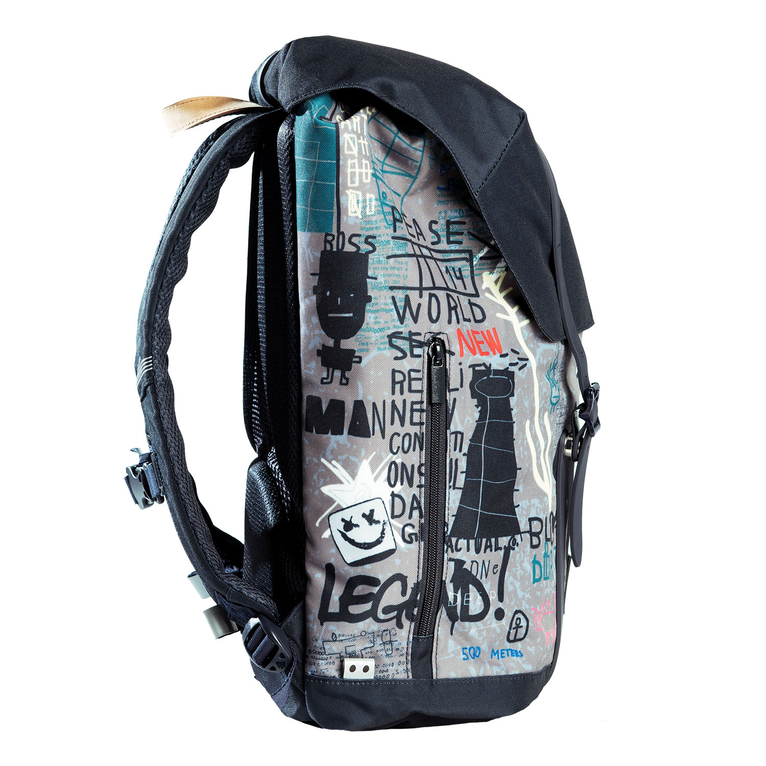 Super cool, retro-inspired backpack with fun designs and leather details! Cool reflectors, just discrete enough, on all sides of the backpack. Snap hook for keys in a side pocket and a matching rain cover at the bottom. Magnetic closures on the straps – quick and easy! Finally an ergonomically correct backpack which also looks cool for this age group.