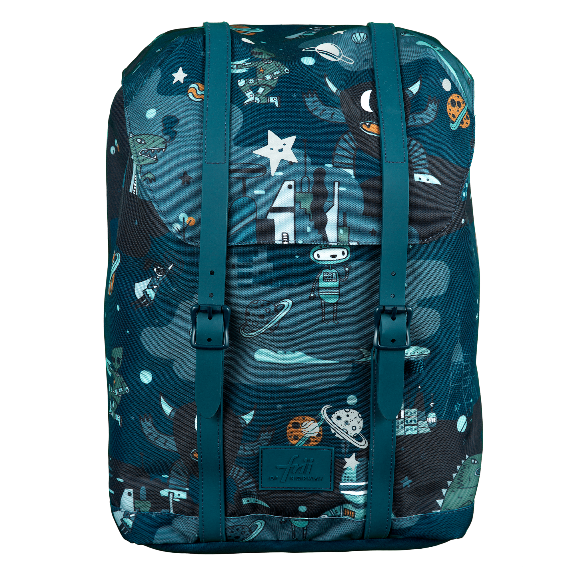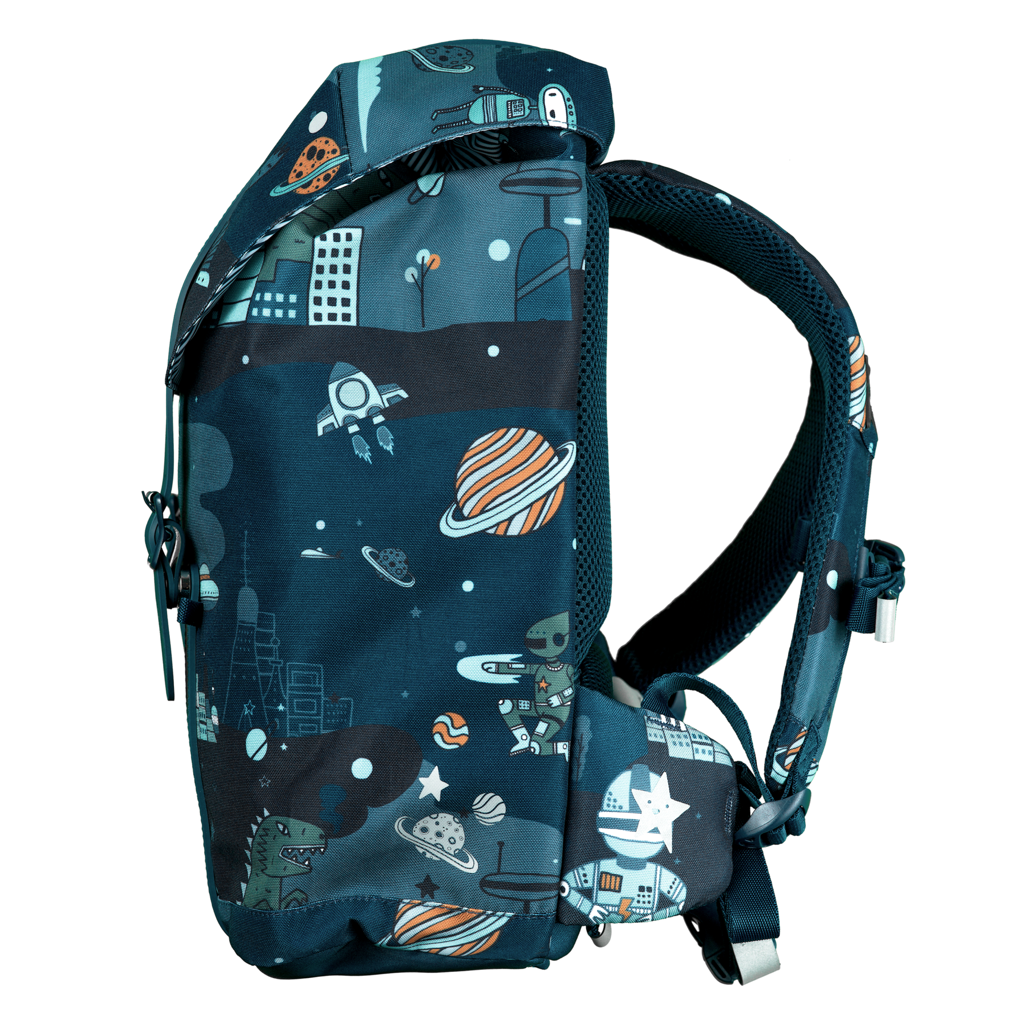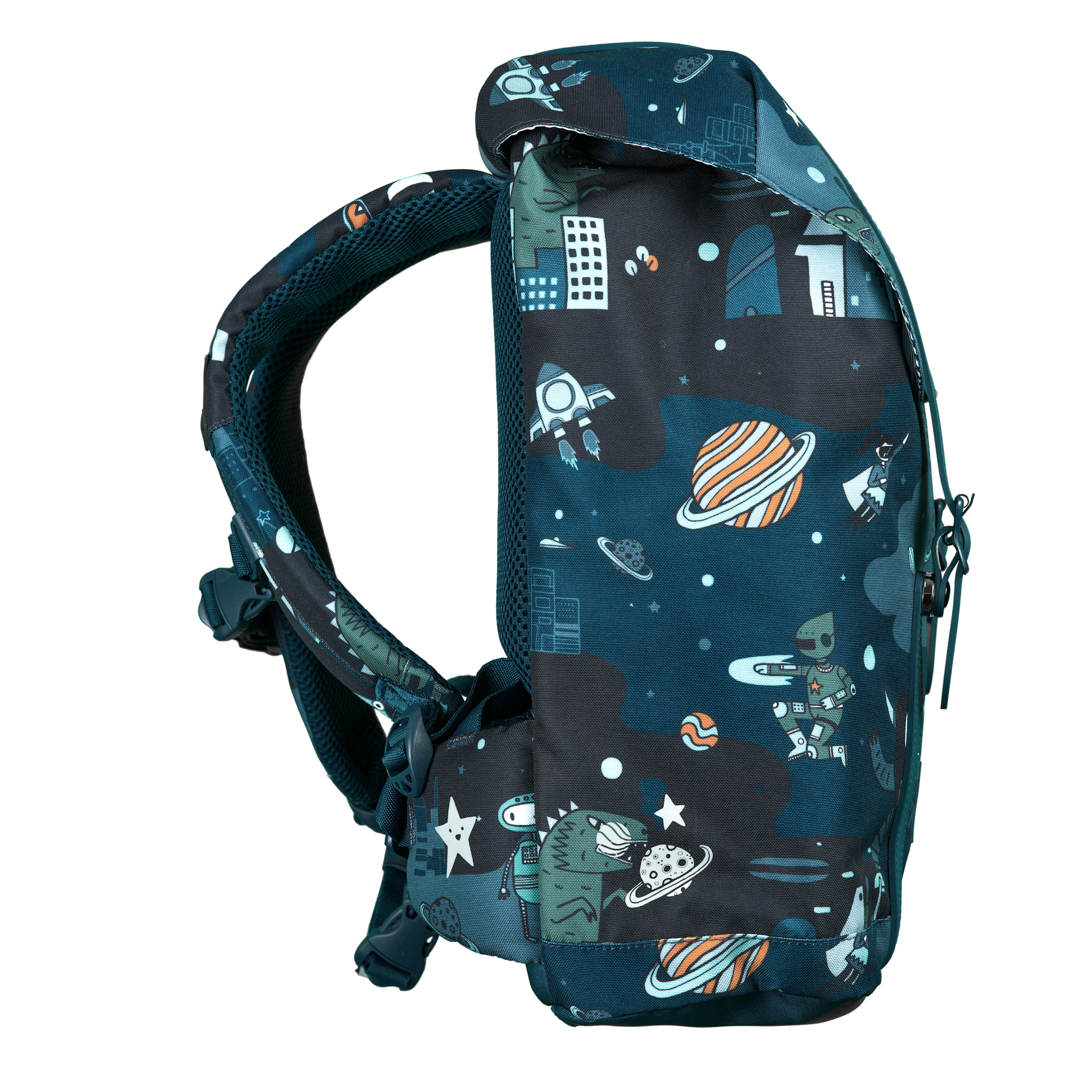 An exciting universe where flying superheroes will save the world from scary monsters! The backpack is super cool in snazzy colors, petrol, and rusty red. Reflectors are integrated in the design as stars and planets.