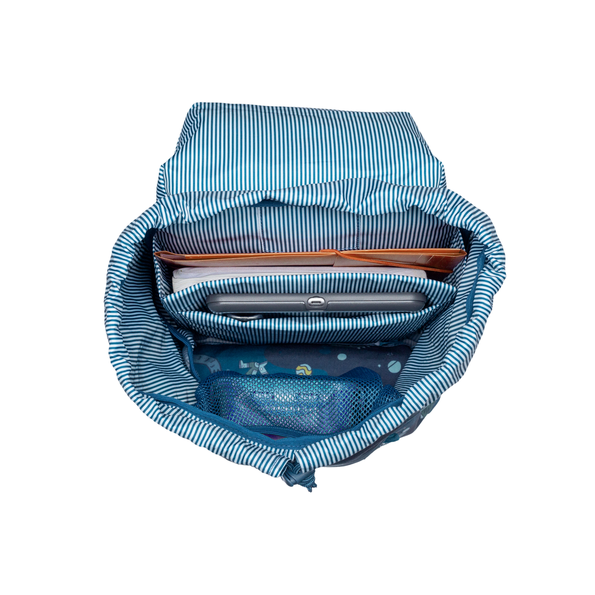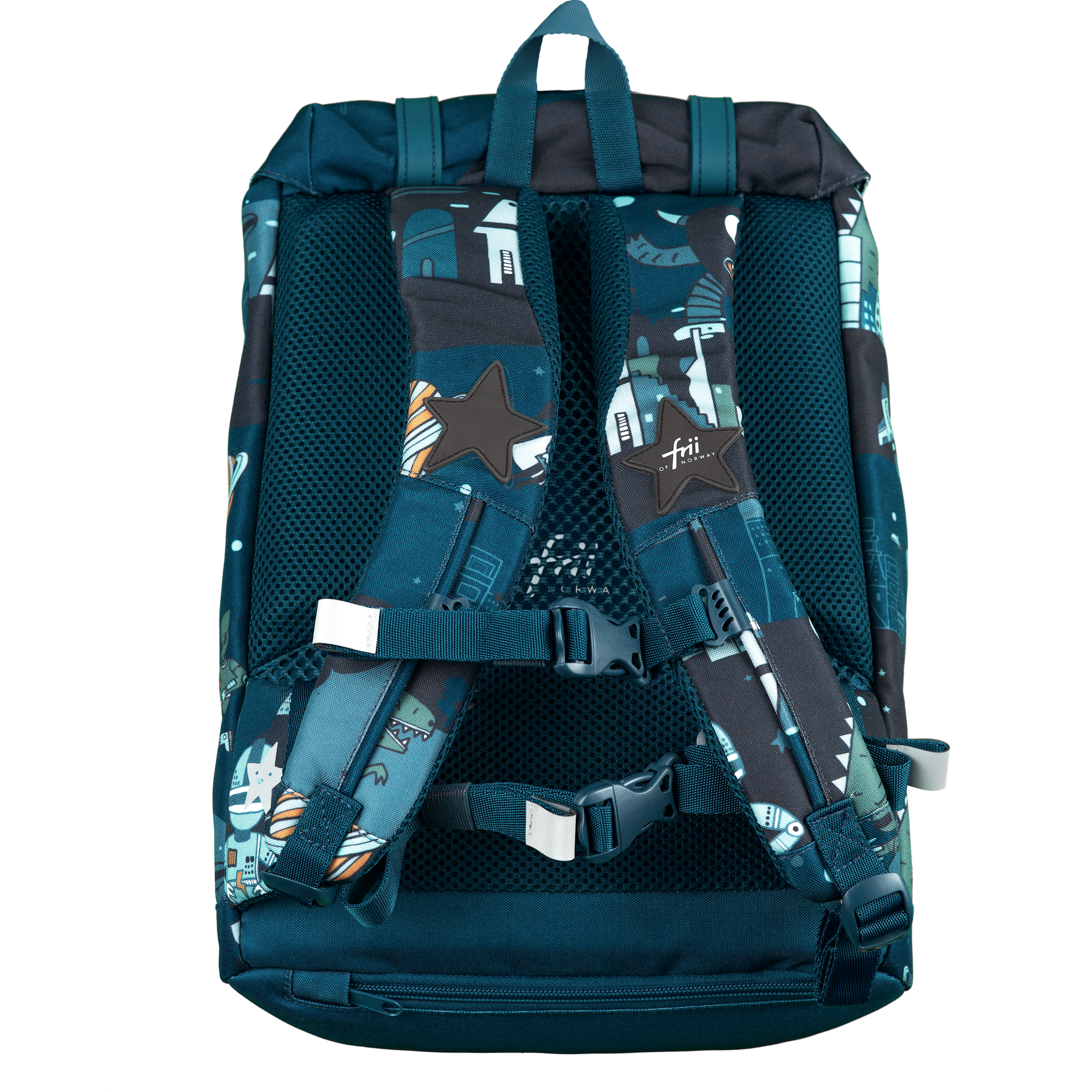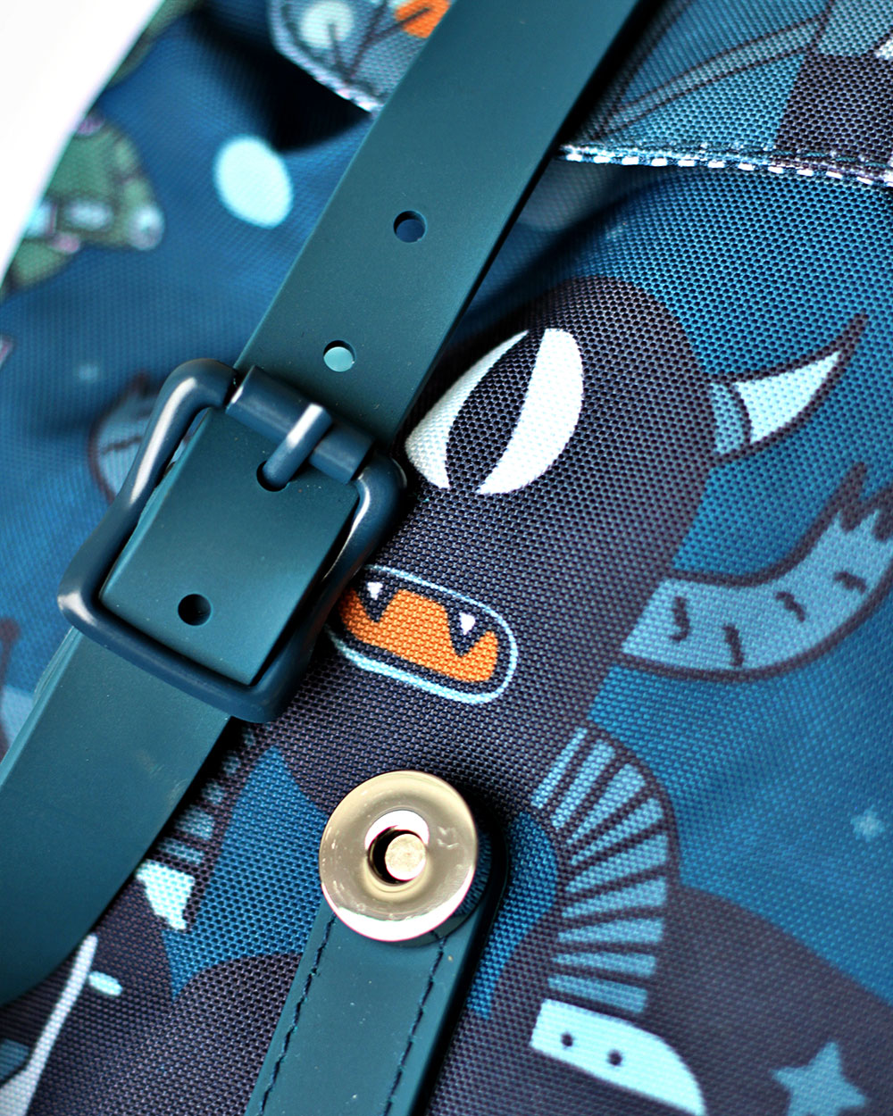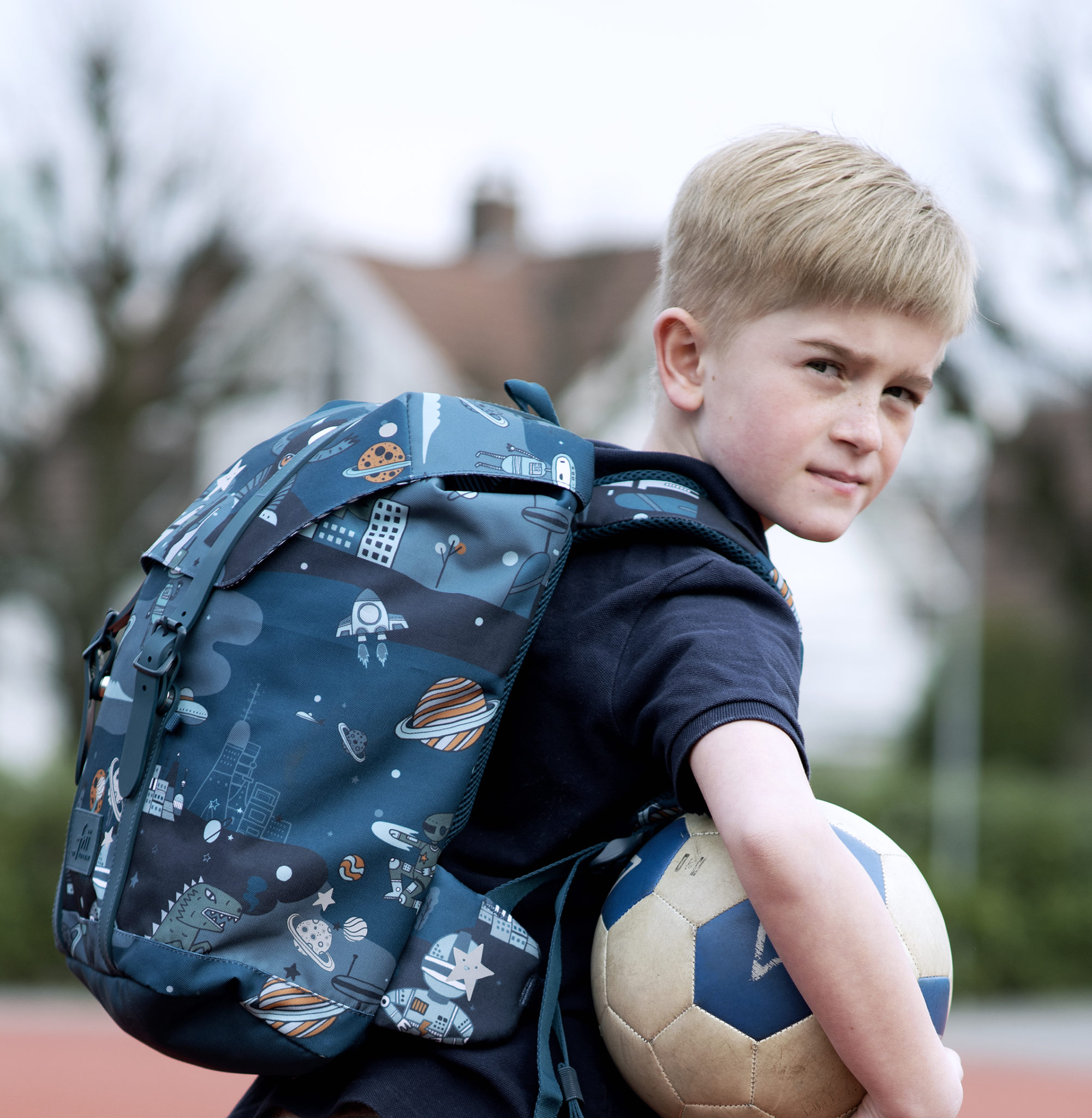 An exciting universe where flying superheroes will save the world from scary monsters! The backpack is super cool in snazzy colors, petrol, and rusty red. Reflectors are integrated in the design as stars and planets.